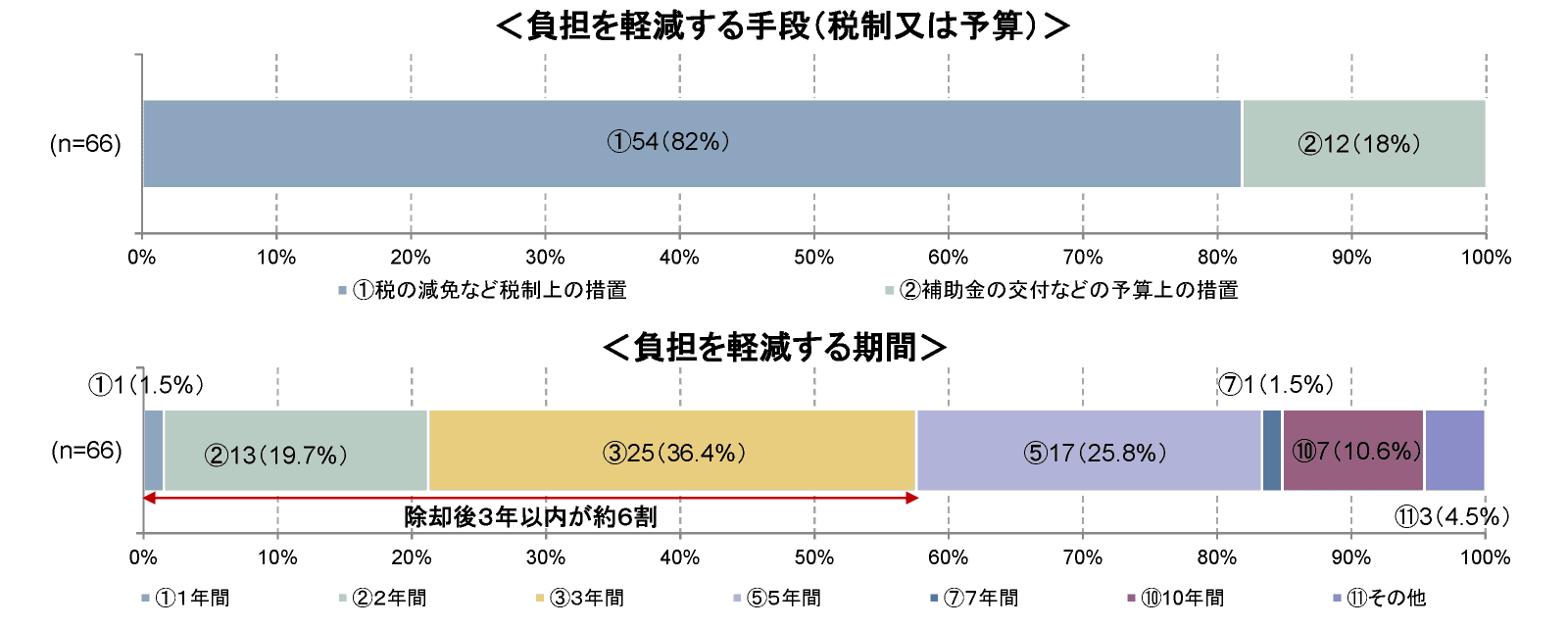 空き家除却後の更地については固定資産税の住宅用地特例が外れ、税負担が急増することから、空き家の解体が進まない状況にありました。これに対し、一部の自治体では条例等により一定の空き家に対して除却後の税負担を軽減する措置が取られています。国土交通省の調査では、回答した66自治体のうち約8割は固定資産税の減免を、約2割は補助金の交付等を行っています。税の減免期間は除却後3年以内が約6割を占めますが、7年~10年に及ぶ自治体もみられます(図表10-1)。